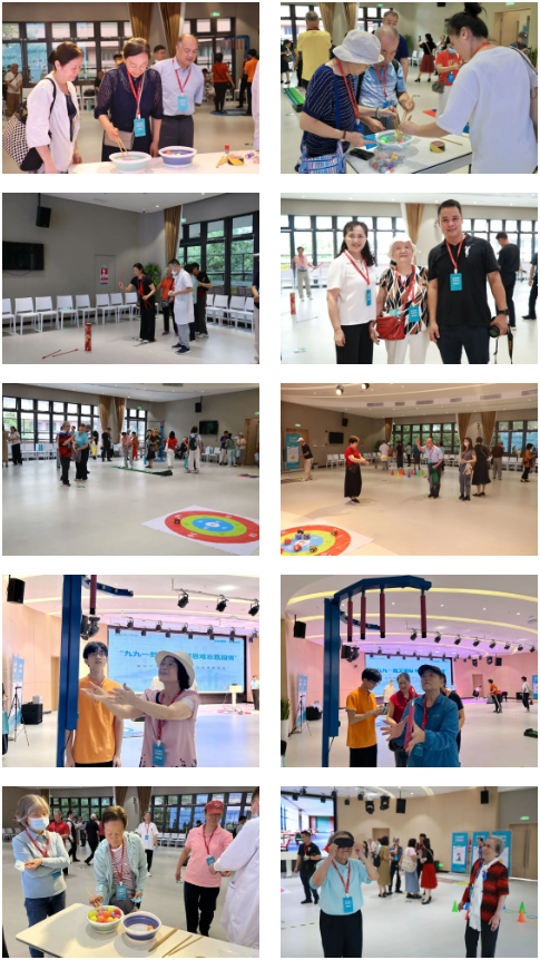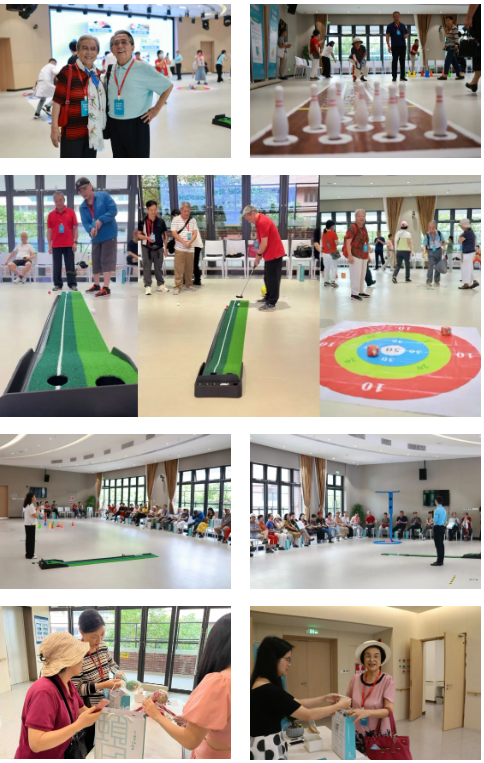 参观结束后,老同志们来到活动中心,参加乐龄集市。这里汇聚了各式各样的趣味小游戏,从经典怀旧的套圈、投壶,到挑战耐心的旱地冰壶、眼疾手快,每一项活动都充满了创意与乐趣。