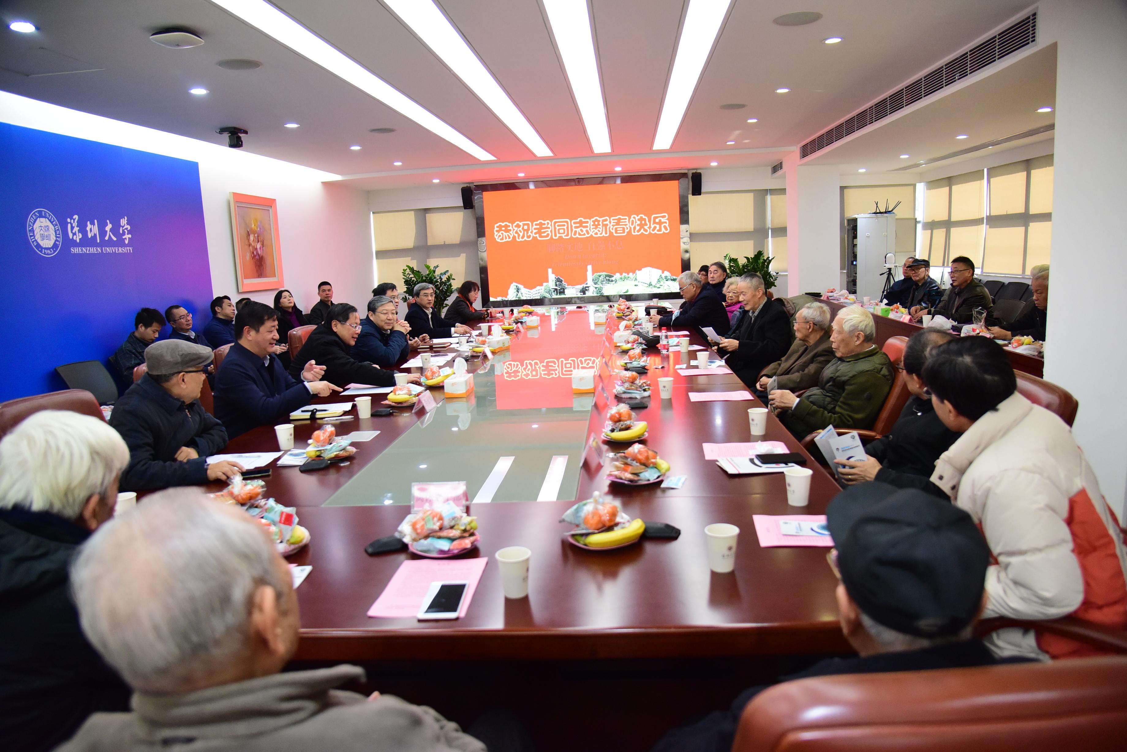 李清泉为老领导、老同志送上新春祝福。针对与会的老领导、老同志提出的问题和建议,他表示,学校将会加强与医院、养老机构的合作,进一步完善离退休教职工的养老保障,并在此方面做一些创新尝试,为深圳市乃至全国日益严峻的养老问题率先做出科学性探索。今年,学校在关照离退休教职工方面做好安排,计划结合建党100周年和深圳特区特色,组织离退休教职工活动,发放慰问礼品,将对老同志的关照融入日常生活中。李清泉希望退休专家在身体允许的前提下,秉承自愿原则,发挥老专家对学校学科建设和人才培养的作用,通过专题讲座和报告等形式与大学生们分享交流,提高学生的学习兴趣和科研兴趣。他感谢老领导、老同志对学校学科建设和未来发展的关切,并表示,学校将以“十四五”规划为抓手,进一步明确下一步发展思路,努力推动学校高水平发展;进一步调整完善高水平人才引进和人才培养政策,努力把发展的“平原”变成“高峰”,在资源投入等方面向重点学科倾斜,使之引领学校的学科发展水平。“我们要让退休同志一起分享学校的发展成果。”李清泉说。