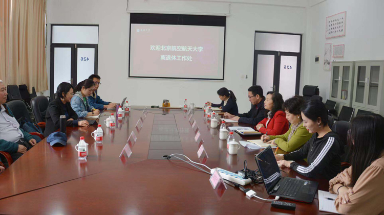 2019年3月13日上午,北京航空航天大学离退休工作处教职工党委副书记曲珊与活动办公室主任刘佳秀等一行5人,前来我校离退休办公室进行调研交流。我校离退休办公室主任兼离退休党委书记王晓峰与办公室全体工作人员一起在综合楼426会议室就离退休老同志的管理服务、党建工作开展、困难帮扶慰问、文体活动进行及信息化建设等方面进行了交流。