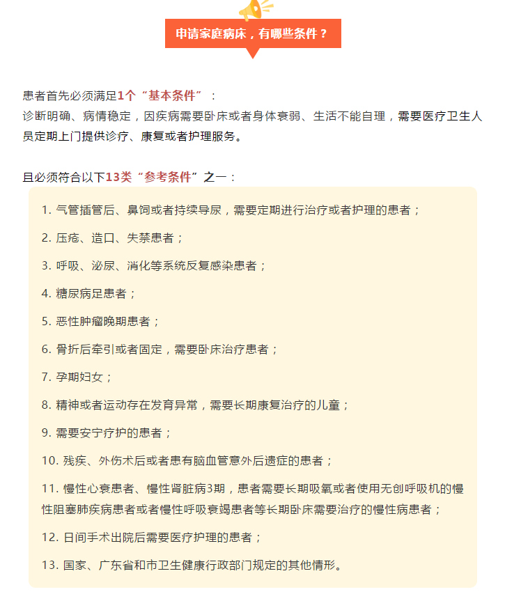 2021年2月,深圳市卫健委、深圳市医保局联合发布修订后的《深圳市家庭病床管理办法(试行)》,将服务对象扩大到13类,比如瘫痪的老人、需要临终关怀的晚期肿瘤患者、需要卧床保胎的孕妇、需要持续照料的早产儿;与此同时,降低了承办机构的“门槛”,所有社康中心及其举办医院都可以提供家庭病床服务。新修订的管理办法从 2021年3月1日起施行。