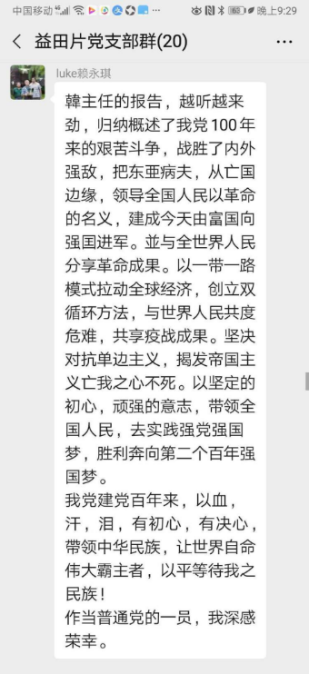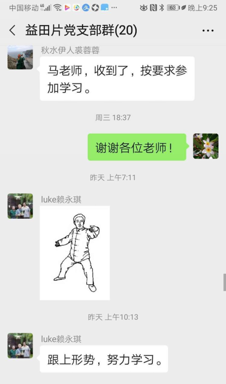 益田村党支部老党员、老教授居多,其中有多位90岁高龄的老党员同志,他们认真准备,学习活动当日,大家积极在支部微信群里发表自己的看法和学习心得。