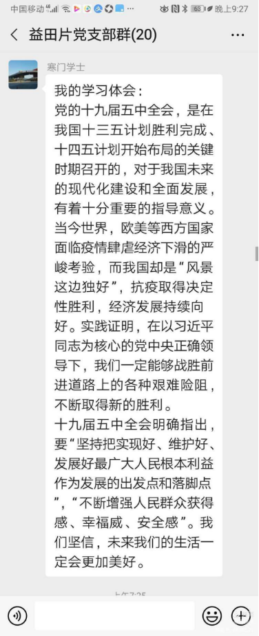 为深入学习贯彻习近平新时代中国特色社会主义思想,认真学习领会党的十九届五中全会精神,进一步突出政治引领,益田村党支部根据离退休党委《关于组织收看党的十九届五中全会辅导报告的通知》精神,落实新冠肺炎疫情防控常态化要求,首先召开线上支委会部署学习安排,确定开展线上专题学习会,在支部微信学习群里及时发布关于组织收看党的十九届五中全会辅导报告学习讨论会的通知及相关学习资源。学习过程中,党员同志们积极参加,踊跃发言,畅抒胸怀,充分表达了一个共产党员热爱祖国热爱党的政治情怀。