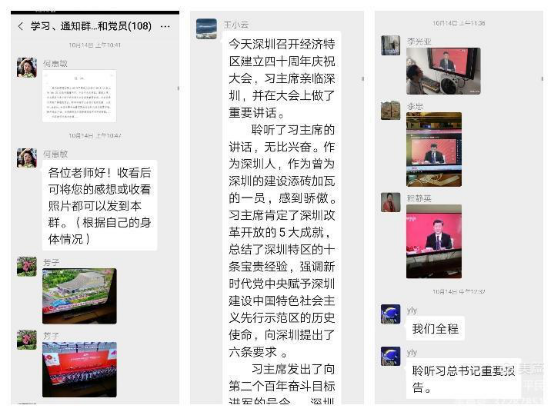 近期,梅林支部多次通过微信、电话等方式,向片区退休党员和教师传达学校离退休党委的学习通知和学校疫情防控的工作安排,组织片区党员深入学习习近平总书记在深圳经济特区建立40周年庆祝大会上的重要讲话精神和浦东开发开放30周年庆祝大会上重要讲话内容,学习领会党的十九届五中全会精神,并组织大家通过微信群进行交流和讨论。