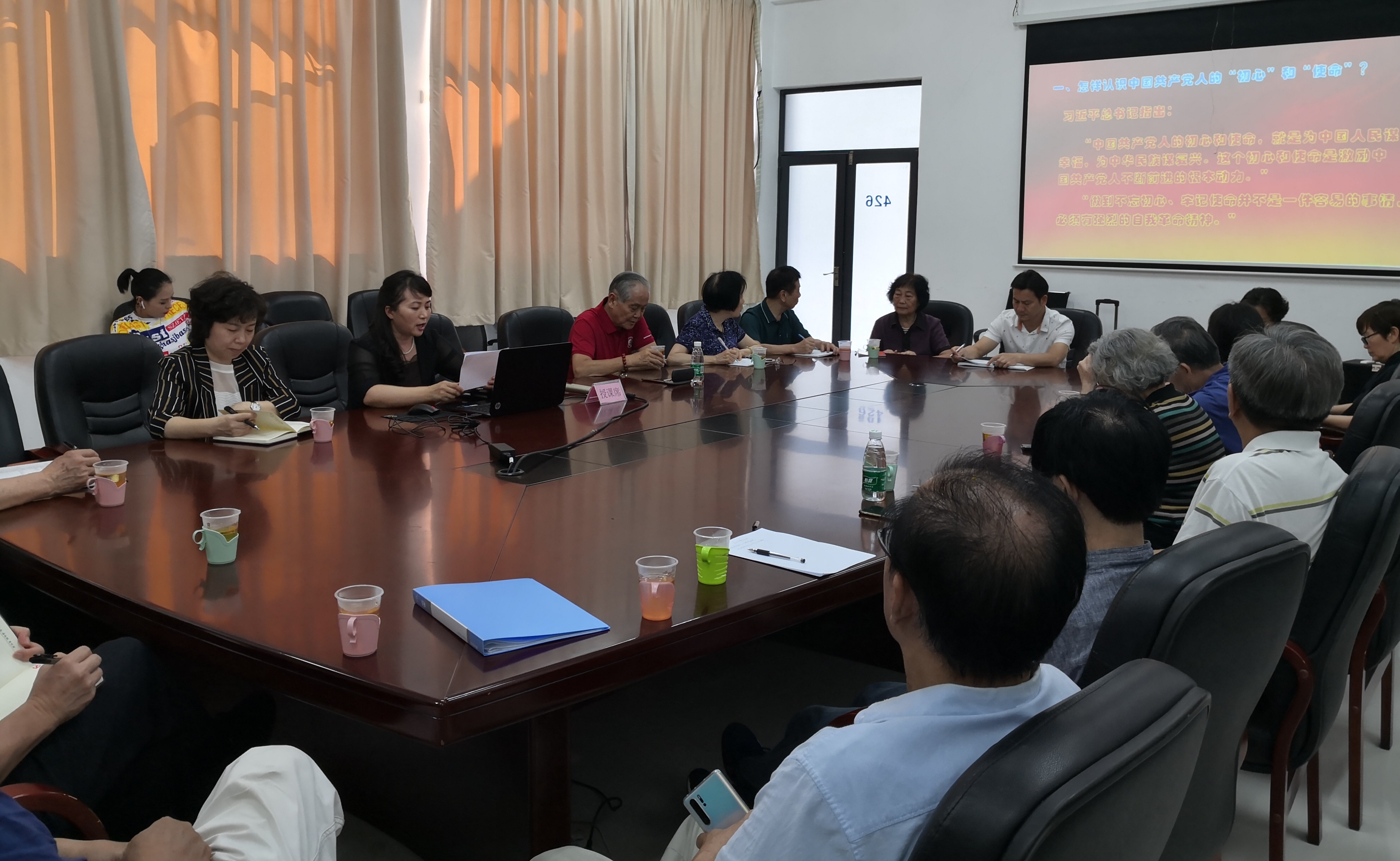 党课后老同志们纷纷发言:校内二支部杨松老师说,通过党课学习和讲座,深受教育和启发,希望把总结后的党课和讲座内容传达到支部;深大新村南支部陈晓军老师提到,吴教授的讲座对党史的论述深入浅出、图文并茂、精彩精辟精准;附中支部高兴中老师发言:离退休党委王书记的党课,把上级党委、中央和习近平主席的指示精神表达得精准、全面而又深刻,更加清晰地认识到,当前“不忘初心、牢记使命”主题教育的意义、方向、方法、要求和途径,是离退休全体党员和各党支部今后工作的指南和坐标。同时高度赞扬吴教授的报告通过对我军我党从无到有,从小到大,从弱到强,从稚嫩到成熟的发展历程,以五个最有代表意义的标志性的革命圣地为载体,准确的概括其中的要点和特点,不仅说明了中国的马克思主义者在中国革命斗争中运用的艰巨性特殊性伟大性,还具体的说明了当下我们所不忘的初心和应该坚守的信仰……大家一致表示:每个党员同志要将学习和实践结合起来,系统深入学习习近平新时代中国特色社会主义思想,要勇于担当,主动作为,不忘初心;从主题教育中,做到理论学习有收获,思想修养受洗礼,正心修身,坚守共产党人的精神家园。