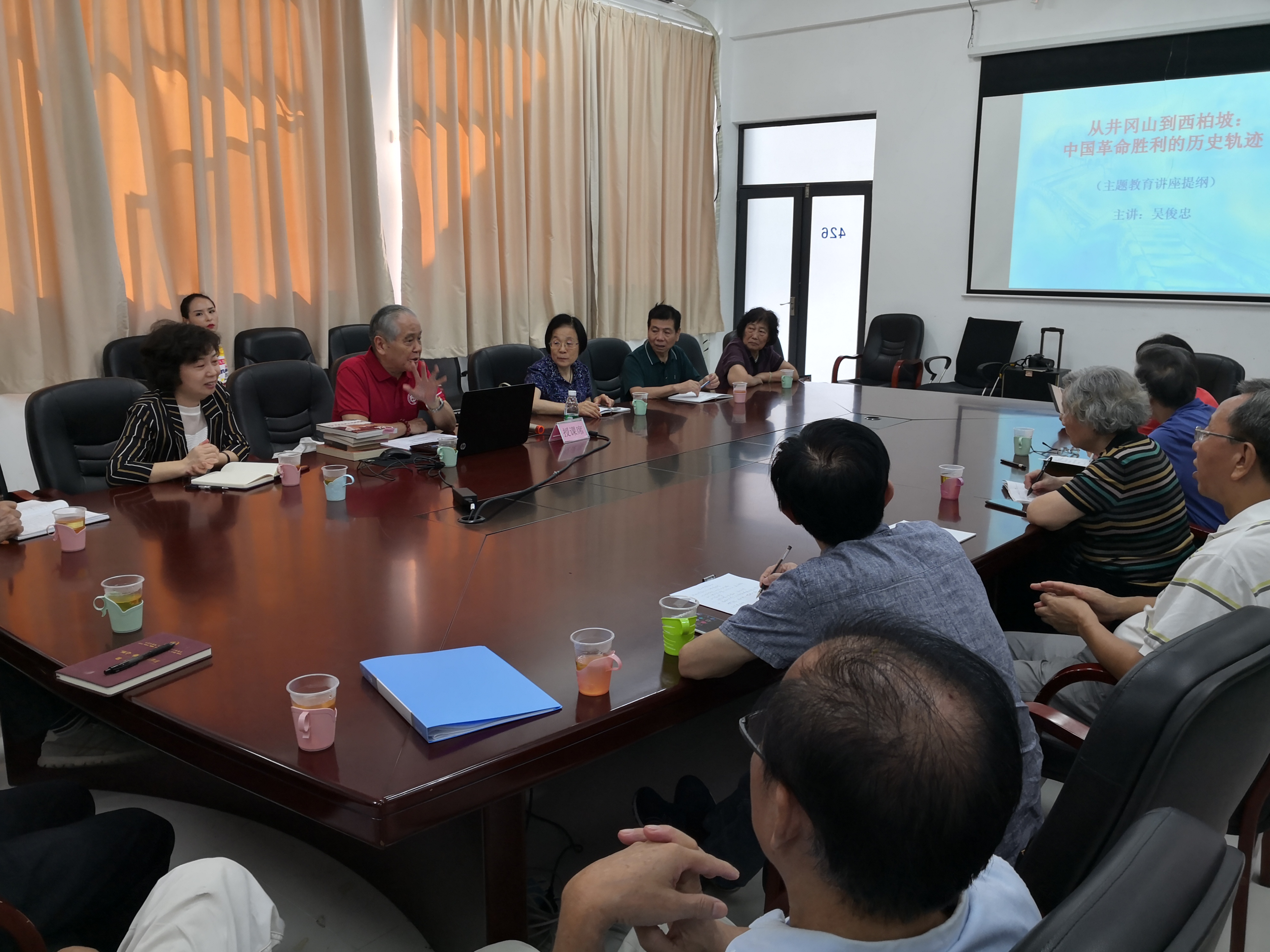 在接下来的学习中,离退休党委委员吴俊忠教授做了《从井冈山到西柏坡》的专题党史讲座。吴教授从参观井冈山、瑞金、遵义、延安、西柏坡五大革命圣地的所见所闻,传承红色基因的角度讲起,以历史资料、著作和独特的思考做为讲座背景,在他底蕴丰厚,深入浅出的讲述下,带领与会同志们回顾了五个不同的历史阶段党的光辉历程和中国革命胜利的历史轨迹。吴教授讲座内容底蕴丰厚,概括精准、生动精彩,受到了与会老同志的一致赞扬。