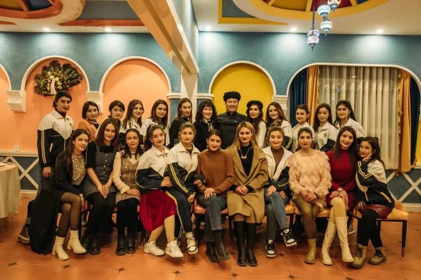 林培汉校友(后排左8)及夫人(后排左7)和20多位塔吉克中专师范毕业姑娘合影